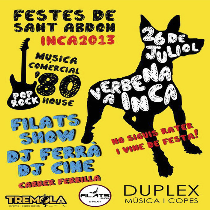Divendres 26, amb motiu de les festes de Sant Abdòn d’Inca montarem la nostra primera verbeneta, per riure un poc, beure i escoltar bona música a càrrec de Filats Show, Dj Ferrà i Dj Cine amb els que disfrutarem d’un espectacle total i d’una nit a la fresca.